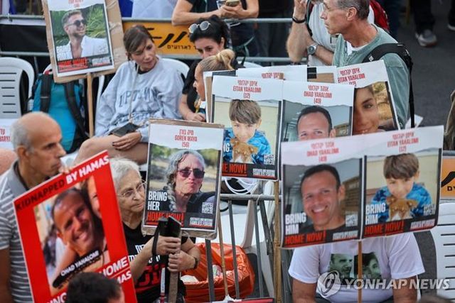 18일(현지 시각) 이스라엘 예루살렘 총리실 밖에서 팔레스타인 무장정파 하마스에 억류된 인질 가족과 지지자들이 시위를 벌이고 있다. / 예루살렘 AFP