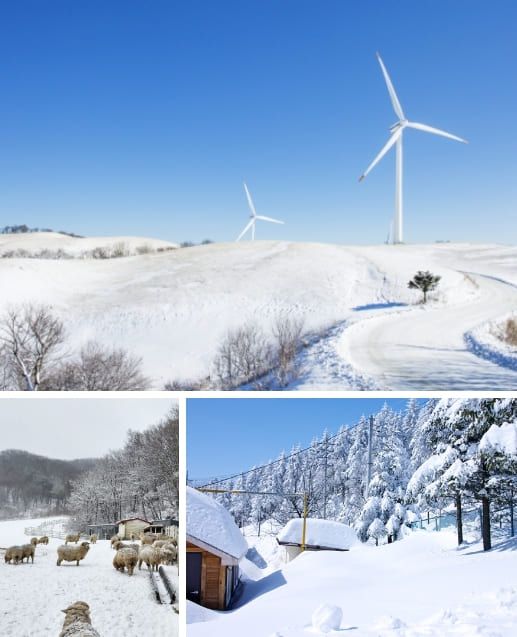 대관령 양떼목장은 겨울에는 양들을 방목하지 않지만, 한쪽에 마련된 공간에서 건초주기 체험은 즐길 수 있습니다. 또 대관령 양떼목장에는 겨울철에 방문하면 더욱 아름다운 풍경을 감상할 수 있는 곳으로 하얀 눈으로 뒤덮인 초원을 보며 아이들과 함께 눈사람을 만들며 뛰어놀다 보면 마치 동화 속 세상에 온 듯한 느낌을 줍니다.