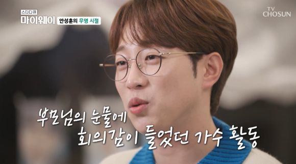안성훈은 "아들이 초대 가수로 갔는데 막일하는 모습을 부모님이 보셨으니 너무 속상했다. 내가 음악을 계속 이렇게 하는 게 맞나. 부모님을 자랑스럽게 해드리려고 했는데 속상하게 해드린 게 아닌가. 그때 가수를 포기해야겠다고 생각했었다"고 고백했다.