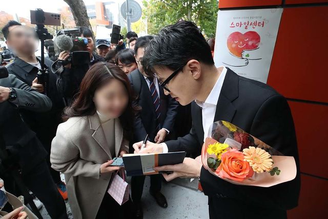 한동훈 법무부 장관이 17일 오후 대구 수성구 만촌동 대구스마일센터를 찾아 직원 간담회를 마치고 나와 입구에서 기다리던 시민에게 사인을 해주고 있다. 스마일센터는 강력범죄 피해자와 그 가족 및 보호자를 대상으로 심리치유와 임시거처 등을 제공해 일상생활 복귀를 지원하는 범죄피해 트라우마 통합지원 기관이다. / 뉴스1