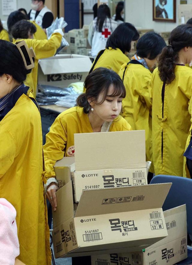 한동훈(50) 법무부 장관의 부인인 진은정(48) 변호사가 15일 서울 중구 소파로 대한적십자사 서울사무소 앙리뒤낭 홀에서 열린 ‘2023 사랑의 선물’ 제작 행사에서 선물꾸러미를 제작하는 봉사활동을 벌이고 있다. / 뉴스1