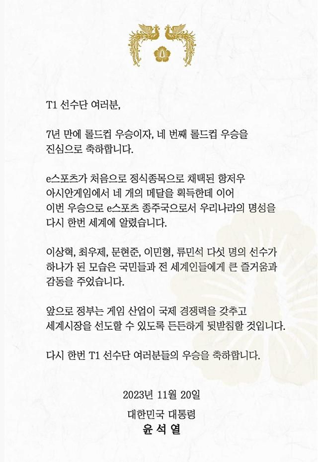 20日,韩国总统尹锡悦向电竞战队T1发送贺电,祝贺他们获得2023英雄联盟全球总冠军。在前日举行的2023年度《英雄联盟》S13全球总决赛巅峰对决中,T1战胜中国战队WBG,第四次捧起全球总冠军奖杯。