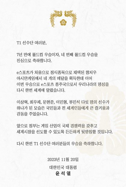 윤 대통령은 이날 사회관계망서비스(SNS)에 올린 축전에서 “7년 만에 롤드컵 우승이자, 네 번째 롤드컵 우승을 진심으로 축하한다”고 밝혔다.