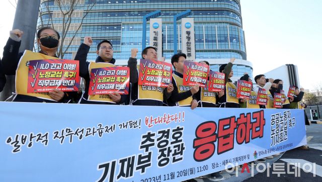 아시아투데이(세종) 박성일 기자 = 양대노총공공부문 노동조합 공동대책위원회는 20일 오전 세종시 정부세종청사 중앙동 앞에서 일방적 직무성과중심 보수체계 개편을 규탄하는 기자회견을 열고 정부의 노정교섭을 촉구하고 있다.