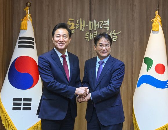 오세훈 서울시장(왼쪽)과 이동환 고양특례시장이 21일 오전 서울시청에서 열린 '메가시티 서울' 논의를 위한 회동에 참석해 인사를 나누고 있다. ⓒ 연합뉴스