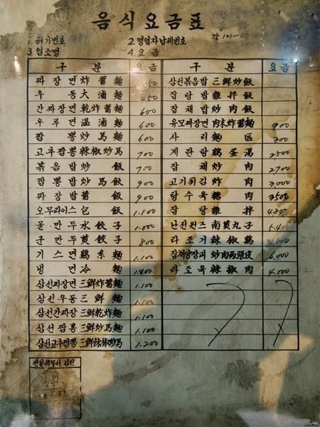 과거 중국집 메뉴판으로 음식 요금표라는 이름으로 메뉴와 가격이 나열되어 있다.