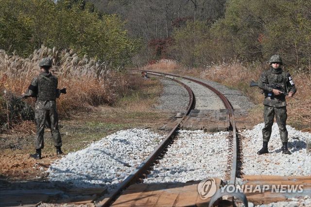 남방한계선 통문 철길 주변으로 군인들이 경계근무를 서고 있는 모습 / 연합뉴스