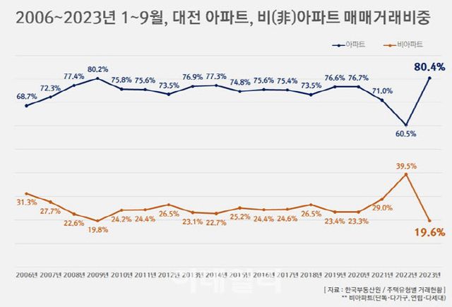 23일 부동산 종합 대행사 비앤씨가 한국부동산원의 주택유형별 거래현황을 분석한 자료에 따르면 올해 1~9월 대전 주택 매매거래량은 1만 2,210건으로 조사됐다. 이 중 아파트 매매 거래량은 9,815건으로 아파트 매매 거래 비중이 80.4%로 집계됐다. 이는 한국부동산원이 관련 통계를 작성하기 시작한 2006년(1~9월 기준)이래 가장 높은 비중이다.