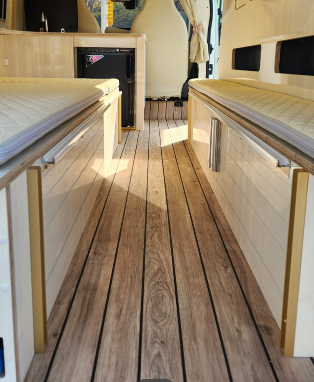 밴의 격벽을 없애 넓은 공간을 확보하고 나파가죽퀼팅매트에 씽크대, 트렁크 테이블을 설치했다.