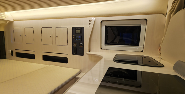 주방기구는 Haatz 매립형인덕션과 SK매직 20리터 전자렌지, 그리고 비클시네마의 안드로이드전동TV, 인켈 블루투스오디오까지 갖췄다. 특히 인버터를 설치, 외부 전원을 손쉽게 연결할 수 있어 어디서든 편리하게 사용할 수 있다.