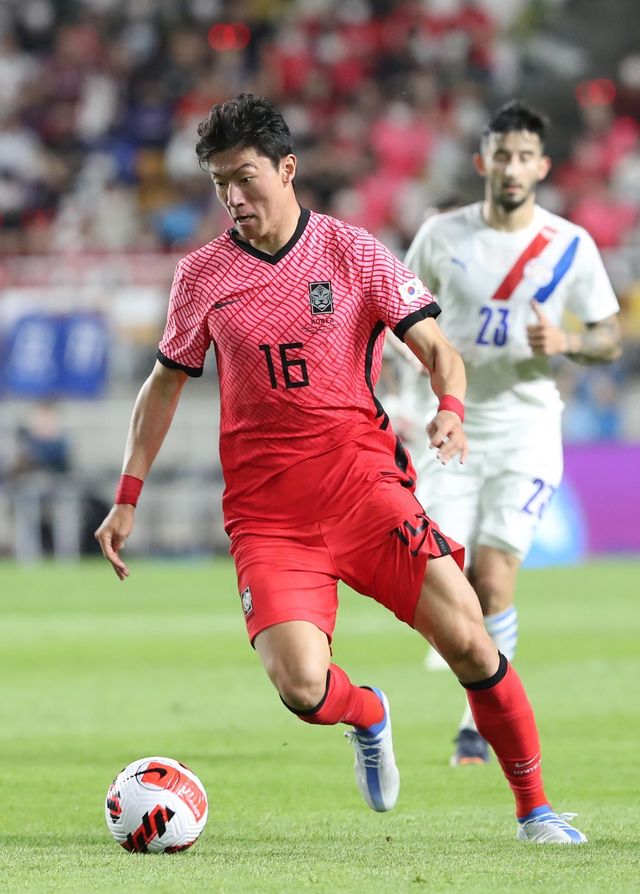 황의조가 지난해 6월 10일 경기 수원월드컵경기장에서 열린 2002 한일월드컵 20주년 기념 평가전 대한민국과 파라과이의 경기에서 돌파하고 있다. / 뉴스1