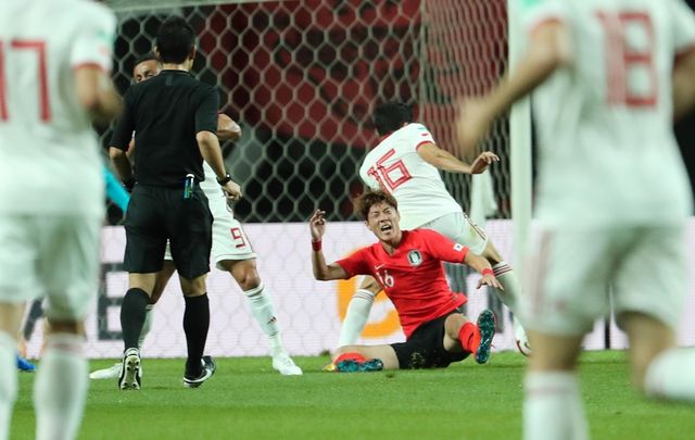 황의조가 2019년 6월 11일 서울 마포구 상암월드컵경기장에서 열린 축구 국가대표팀 평가전 대한민국과 이란의 경기에서 테클에 걸려 넘어지고 있다. / 뉴스1