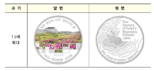주화 앞면은 사계절 특징을 잘 나타내는 자연경관을, 뒷면은 각 산의 등고선과 높이를 표시한다. 앞면은 창문을 통해 산을 바라보는 듯한 느낌이 들도록 사각 프레임을 적용했다.