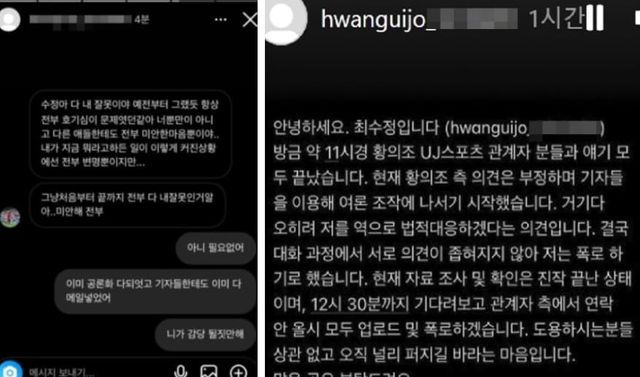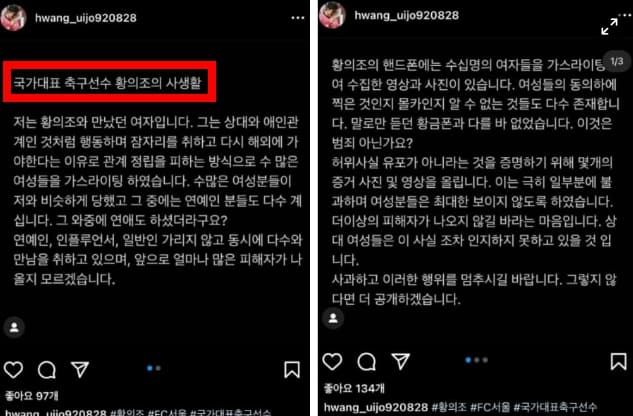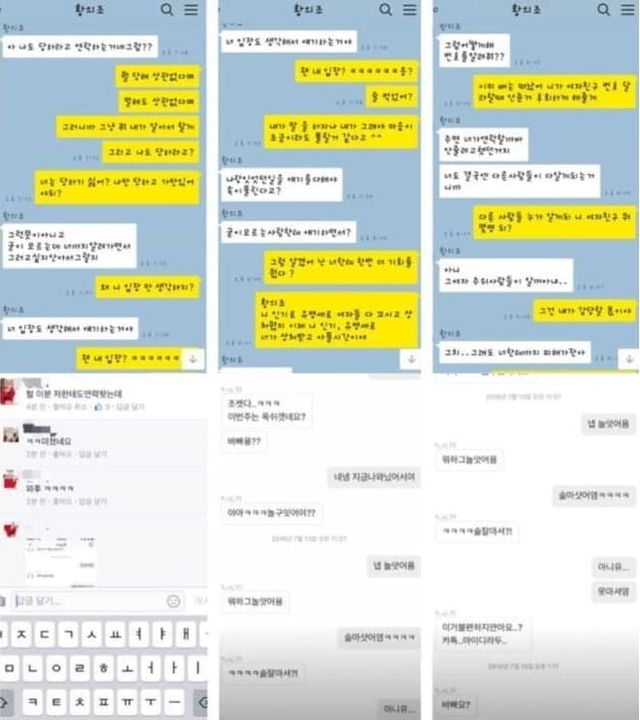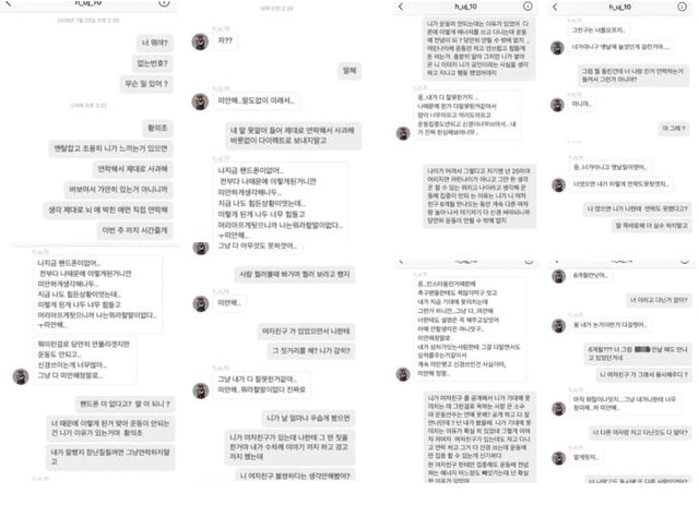 A씨는"더 이상의 피해자가 나오지 않길 바라는 마음이다. 상대 여성들은 이 사실조차 인지하지 못하고 있을 것"이라며 "황선수는 사과하고 이런 행위를 멈추길 바란다. 그렇지 않으면 더 공개하겠다"고 경고했습니다. A씨는 마지막 게시물에서 "황선수 휴대전화, 카톡 다 털렸다. 주변에 피해 주기 싫으면 스스로 인정하고 사과해라. 상상 이상의 유명인들까지 많이 만나셨던데, 그분들은 이런 사실을 알고 만났겠냐"고 했습니다.