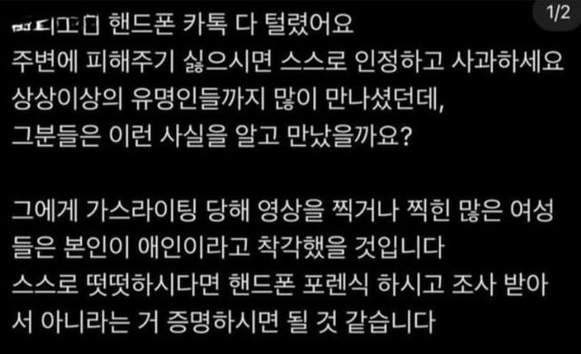 동시에 "황선수에게 가스라이팅 당해 영상을 찍거나 찍힌 많은 여성은 본인이 애인이라고 착각했을 것"이라며 "스스로 떳떳하시다면 휴대전화 포렌식하고 조사받아서 아니라는 거 증명하라"고 덧붙였습니다.