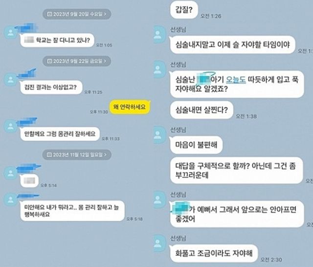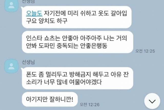 급기야 "자기 전에 미리 쉬 하고 옷도 갈아입고 양치도 해라" "사회관계망서비스(SNS)는 안 좋다. 난 거의 안 본다. 도파민 중독되는 안 좋은 행동" "아기지만 잘하니까" "심술 내지 말고 이제 슬슬 자야 할 시간이야" "○○이 예뻐서 그래. 앞으로 안 아프면 좋겠어" "아기 ○○ 일어나면 물 마시고 어지러우니까 조심해서 다녀야 해요" 등 도를 넘는 메시지를 보냈다.