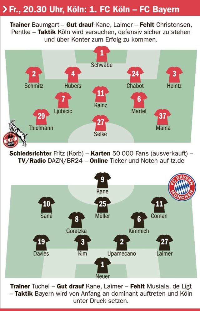 독일 언론도 쾰른전에 김민재가 나설 것이라고 예상했다. 독일 언론 TZ은 쾰른전 예산 선발 라인업을 공개하며 김민재와 다요 우파메카노의 센터백 조합을 전망했다. 출전이 의심되는 선수는 해리 케인과 콘라트 라이머, 두 선수뿐이었다.