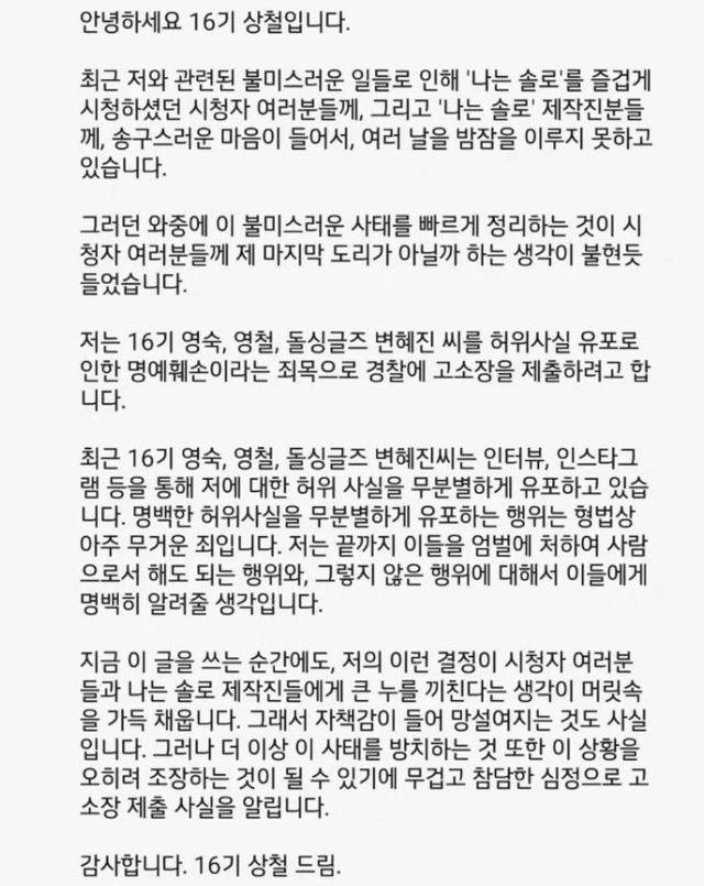 (엑스포츠뉴스 이예진 기자) 파국의 기수라고 불리던 16기 출연자 상철은 오늘(24일) 고소장을 제출하며 본격적인 법적 다툼을 이어간다.