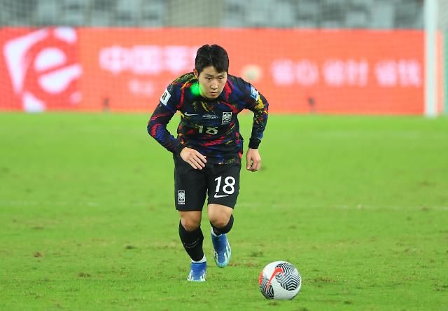 21日晚,韩国足球运动员李刚仁在与中国队的比赛中遭到球迷激光照射。【图片提供 韩联社】