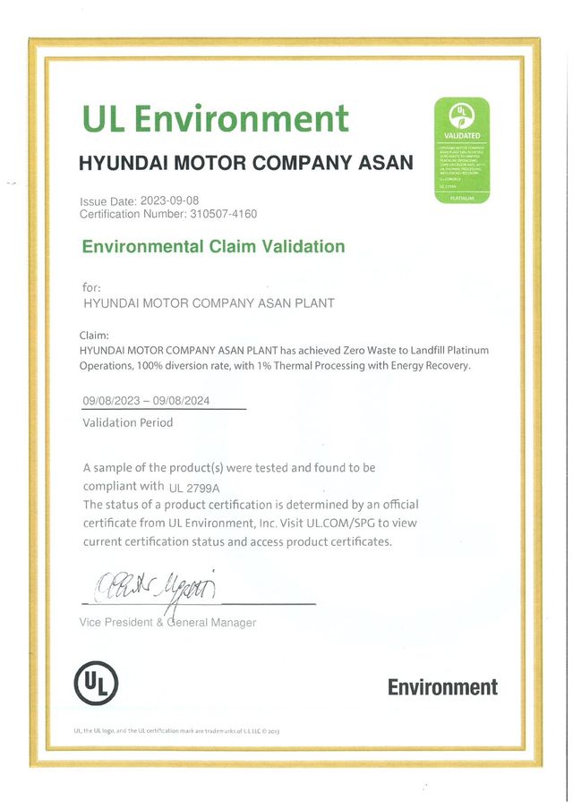 현대차는 아산공장이 국제 안전과학 인증 기관 ‘UL 솔루션(UL Solutions)’의 ‘폐기물 매립 제로(Zero Waste To Landfill) 인증’에서 완성차 제조 기업 중 최초로 가장 높은 플래티넘(Platinum) 등급을 최근 획득했다고 24일 밝혔다.