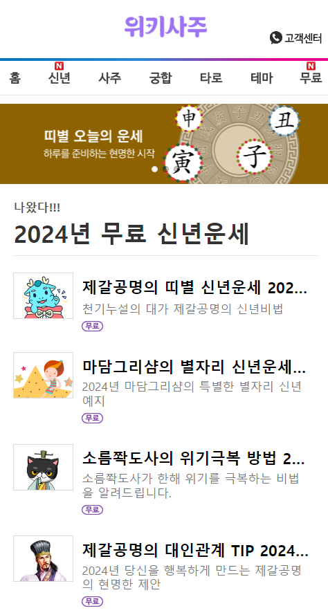 그런 관점에서 비용과 신뢰도의 문제를 해소할 수 있는 신년운세 상품이 출시됐다. 수년간 사주·운세 전문 사이트를 운영해 온 ‘사주닷컴’과 젊은 세대에게 다양한 뉴스를 재미있고 빠르게 전하는 소셜 뉴스 매체 ‘위키트리’ 가 힘을 합쳐 만든 운세 전문 사이트 ‘위키사주’에서 15종의 신년운세를 무료로 출시했다. (15종 무료 신년운세 보러가기)