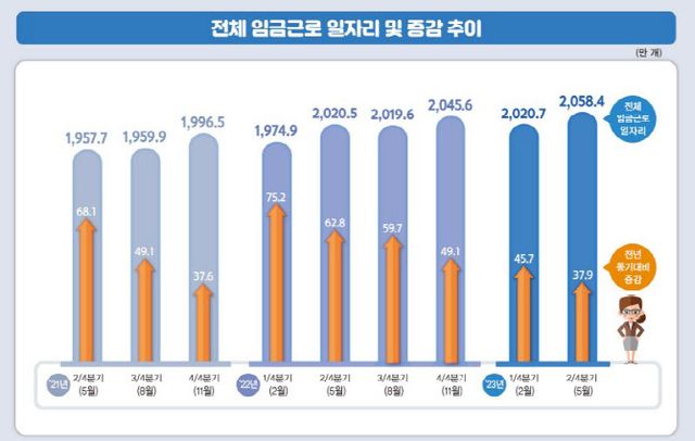 통계청이 24일 발표한 ‘2023년 2분기 임금근로 일자리 동향’에 따르면 올해 5월 기준으로 집계한 임금근로 일자리는 2058만4000개로 전년동기대비 37만9000개가 증가했다. 전체 임금 일자리는 2022년 1분기 전년 대비 75만2000개 증가한 그해 2분기부터 계속 증가폭이 둔화하고 있다.