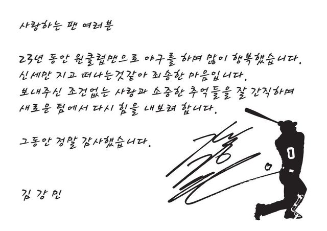 김강민은 한화 구단을 통해 공개된 손편지에 "사랑하는 팬 여러분. 23년 동안 원클럽맨으로 야구를 하며 많이 행복했습니다. 신세만 지고 떠나는 것 같아 죄송한 마음입니다. 보내주신 조건 없는 사랑과 소중한 추억들을 잘 간직하며 새로운 팀에서 다시 힘을 내보려 합니다. 그동안 정말 감사했습니다"라고 적었다.