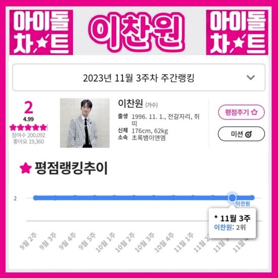 (엑스포츠뉴스 이정범 기자) 이찬원이 11월 3주 차 아이돌차트 평점 랭킹 2위에 올랐다.