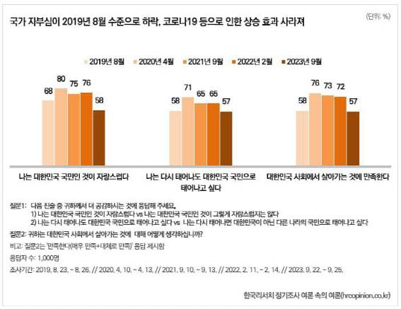 여론속의 여론이 2023년 9월 조사한 결과에 따르면 ‘나는 대한민국 국민인 것이 자랑스럽다’는 응답이 58%이다. 즉, 우리 국민 10명 중 6명은 우리나라 국민인 것을 자랑스럽다고 느낀다. ‘나는 다시 태어나도 대한민국 국민으로 태어나고 싶다’는 응답은 57%, ‘대한민국 사회에서 살아가는 것에 대해 만족한다’는 응답은 57%로 국가 자부심과 관련한 세 가지 질문에 대한 응답결과는 비슷한 수준이다.