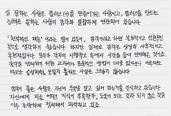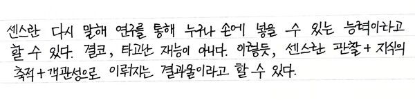 작년 초겨울이었다. “센스가 있지만 최상급의 센스는 아니다”라는 말을 들었다. 듣자마자 바로 든 생각은 ‘최상급이 되려면 어떻게 해야 하지? 센스를 키울 수 있을까?’였다.
