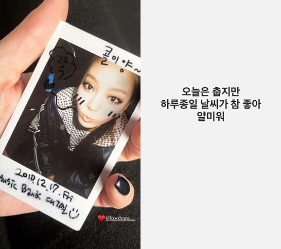 또한 니콜은 구하라의 아이디를 태그하며 그가 직접 낙서해 니콜에게 선물한듯한 폴라로이드 사진을 올렸다. 사진 속 구하라는 2010년의 모습으로 입술을 내밀고 있고 '콜이양'이라는 글씨가 적혀있다.