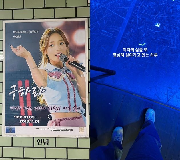 지난 24일 박규리는 "안녕"이라는 글과 함께 구하라를 추억하는 지하철 광고판 사진을 올렸다. 사진 속 광고판에는 구하라의 모습과 '당신의 미소는 언제나 우리들의 마음 속에'라는 문구가 적혀있다.