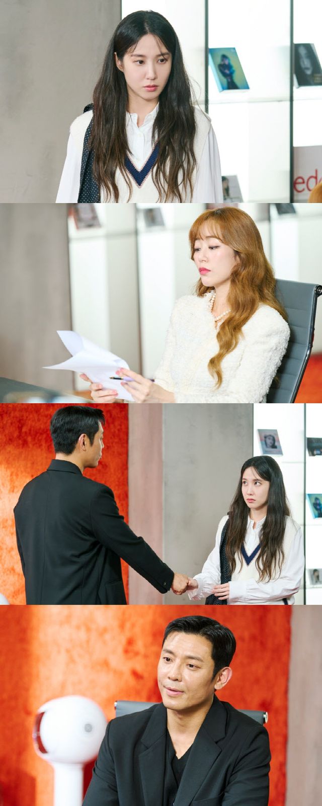 서목하와 윤란주의 끈끈한 우정에 분열이 찾아온 가운데 공개된 사진 속에는 RJ엔터 대표실에서 다시 만난 서목하와 윤란주, 그리고 이서준의 모습이 담겨 있다. 계약서를 훑어보는 윤란주와 이를 보는 서목하의 눈빛에는 냉랭한 기운이 읽혀 간밤의 갈등을 짐작하게 한다.