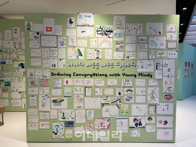 올해로 두 번째를 맞이한 ‘아이와 마음을 나누는 그림 대화’ 전시에선 발달장애 등 장애를 앓고 있는 아이들의 그림이 형형색색 벽을 따라 전시됐다. 해당 그림들은 언어로 소통이 어려운 아이들이 그림치료를 받는 과정에서 자신의 생각과 마음을 표현한 작품이다. 그림 아래엔 장애 아동의 가족들이 이들을 응원하며 직접 그린 그림과 메시지가 함께 액자로 전시됐다.
