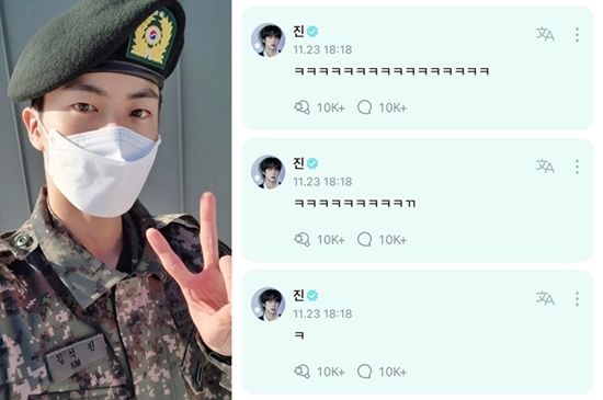 이때 눈에 띄는 댓글이 있었다. 바로 진이 정국의 글에 "ㅋㅋㅋㅋㅋㅋㅋㅋㅋ"라며 웃고 있는 댓글로 여유를 드러낸 것. 앞서 지난해 12월 멤버들 중 가장 먼저 입대한 진은 최근 특급 전사로 선발돼 상병으로 조기진급 하는 등 성실한 군생활을 이어오고 있다.