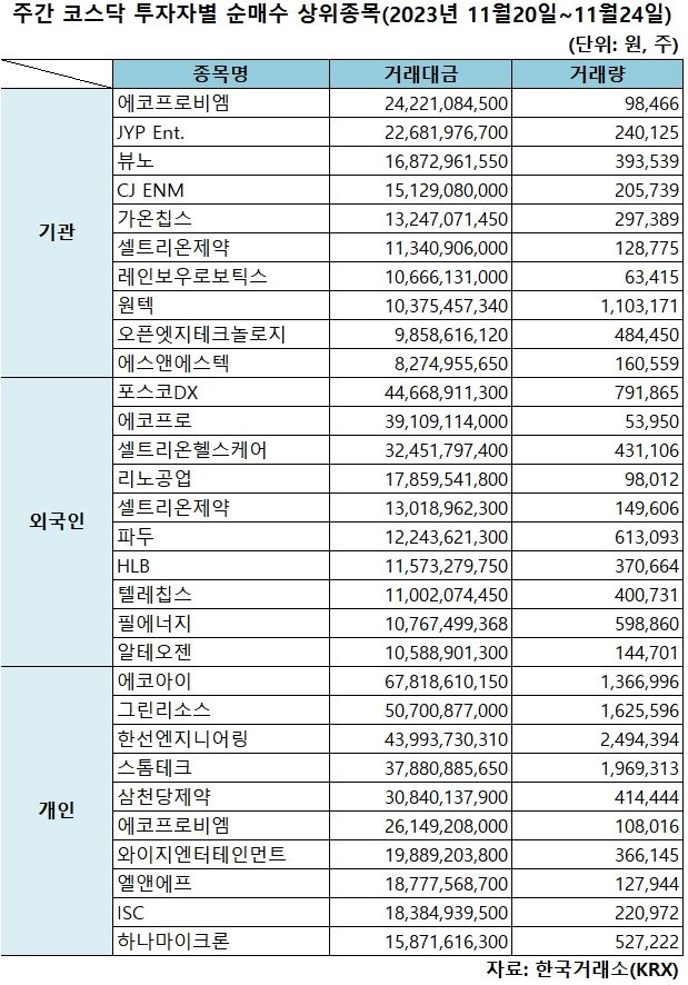 기관 '에코프로비엠'·외인 '포스코DX'·개인 '에코아이' 1위 [주간 코스닥 순매수- 11월20일~11월24일]