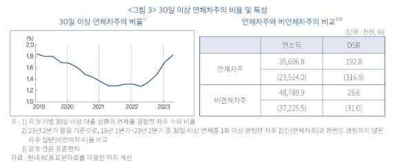 30일 이상 연체를 경험한 차주 비율은 지난해 말부터 증가세를 보여 올해 2분기 1.8%에 달했다. 1.8% 수준은 지난 2019년 이후 4년 만이다. 연체 차주는 비(非)연체 차주보다 연 소득이 27% 낮고 총부채원리금상환비율(DSR)이 166.2%포인트(p) 높았다.