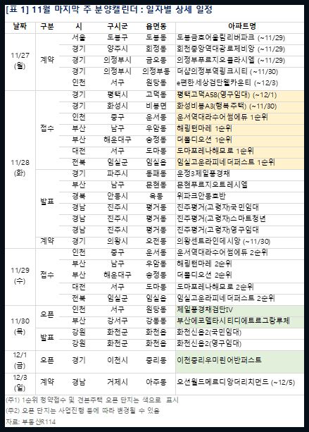 26일 부동산에 따르면 11월 마지막 주에는 전국 7개 단지 총 4774가구(일반분양 2574가구)가 분양을 시작한다. 인천 중구 운서동 '운서역대라수어썸에듀', 대전 서구 도마동 '도마포레나해모로', 부산 남구 우암동 '해링턴마레' 등에서 청약을 진행한다.