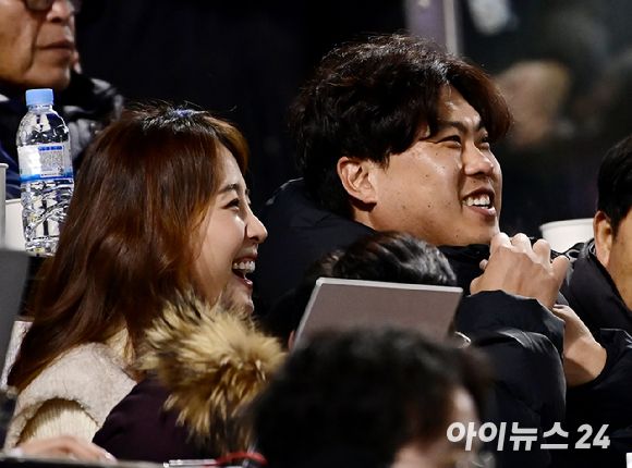13일 오후 서울 잠실야구장에서 열린 '2023 KBO 포스트시즌' LG 트윈스와 KT 위즈의 한국시리즈 5차전 경기가 열렸다. 류현진(오른쪽)과 아내 배지현 전 아나운서가 이날 잠실구장을 찾아 경기를 관전하고 있다. [사진=곽영래 기자]