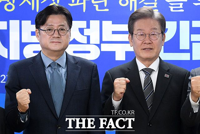 윤석열 정부 지방재정 파탄 해결을 위한 민주당 지방정부 긴급 대책회의에서 기념촬영하는 홍익표 더불어민주당 원내대표(가운데)와 이재명 더불어민주당 대표(왼쪽 여섯 번째) 및 참석자들.