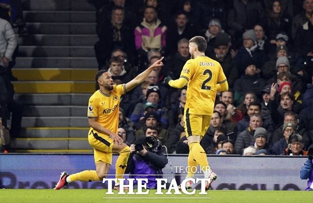 황희찬과 투톱을 이루고 있는 마테우스 쿠냐(왼쪽)의 골 세리머니./런던=AP.뉴시스