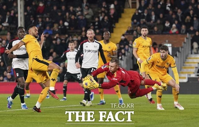 울브스의 슛을 필사적으로 막아내는 풀럼 골키퍼 레노./런던=AP.뉴시스