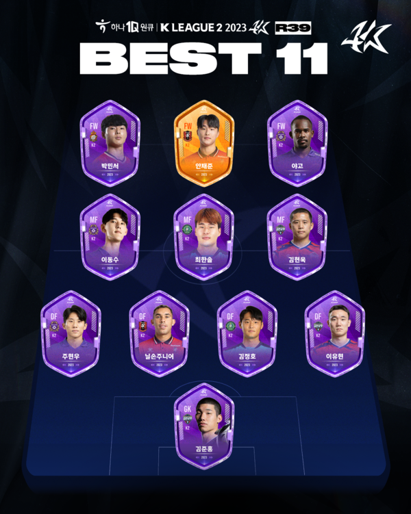 K리그2 39라운드 베스트11에는 야고, 이동수, 주현우를 배출한 FC안양과 김현욱, 이유현, 김준홍이 선택된 김천상무가 가장 많이 이름을 올렸다. 부천에서 안재준과 닐손주니어가, 안산그리너스에서 최한솔과 김정호가 선정됐고 경남FC 박민서도 베스트11에 자리했다.