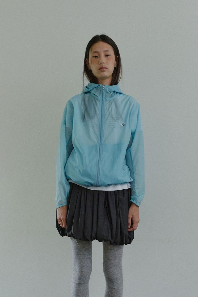 블루 컬러 윈드브레이커에 스커트나 패딩 팬츠를 입어