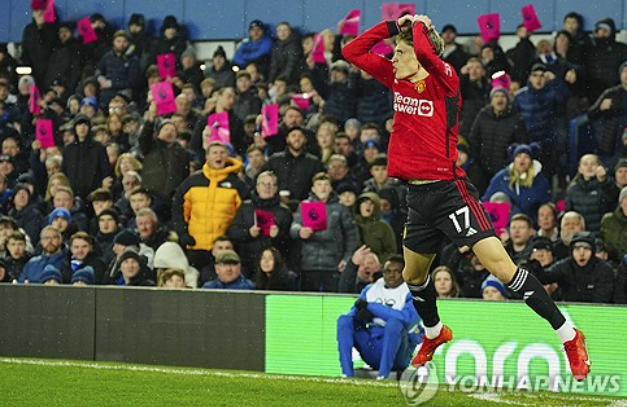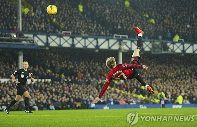 맨유는 28일(한국시간) 영국 리버풀 구디슨 파크에서 열린 에버턴과의 2023/24 잉글리시 프리미어리그 13라운드 원정 경기에서 3-0 완승을 거뒀다. 특히 이날 경기에선 윙어 가르나초가 환상적인 바이시클 킥을 성공시켜 눈길을 끌었다. 가르나초는 동료 풀백 디오구 달로가 측면에서 올린 크로스를 공중에 붕 뜬 뒤 오른발 가위차기로 연결해 골망을 흔들었다. 이날 경기 선제 결승포였다.