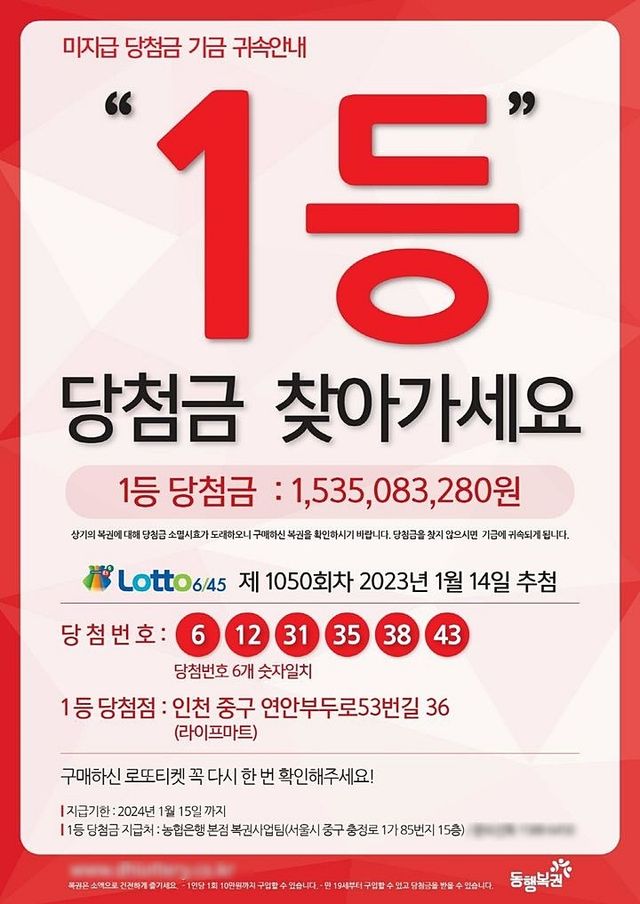 올해 1월 14일 추첨한 제1050회 로또복권 1등 미수령 당첨자 정보 / 동행복권