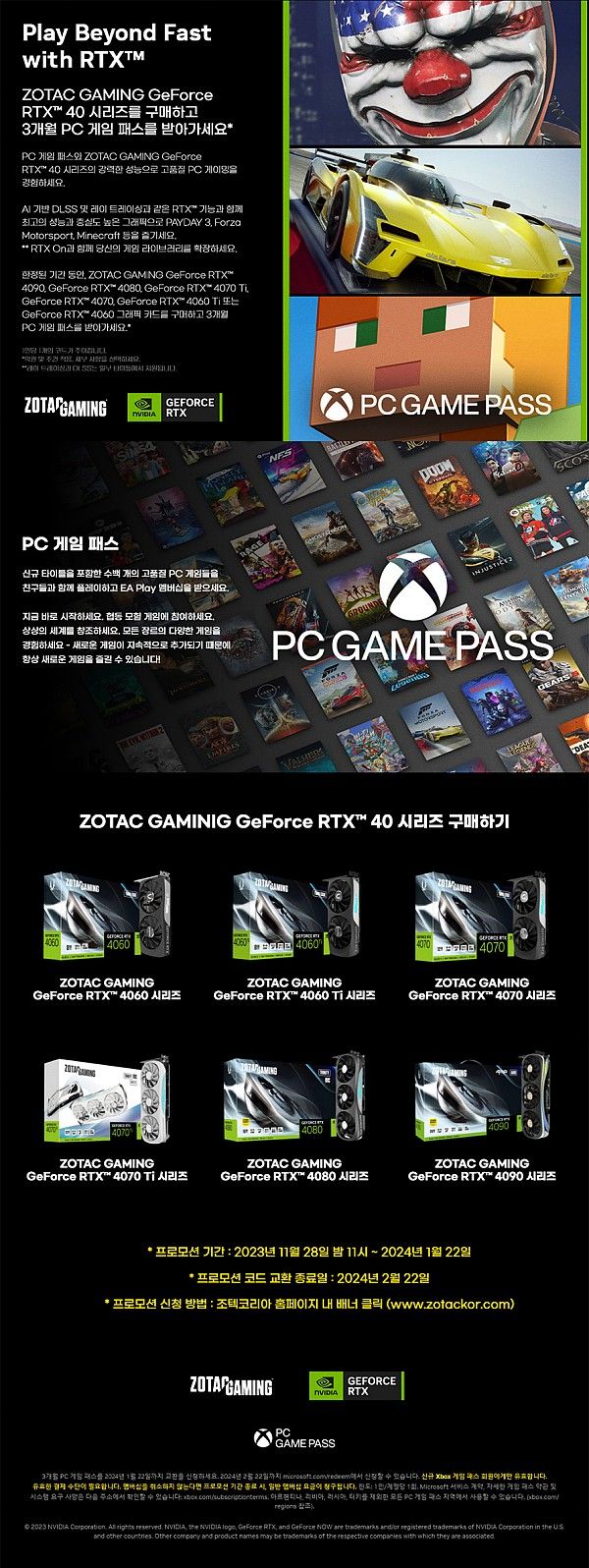조텍코리아가와 엔비디아와 공동으로 최대 3개월 기한으로 게임을 즐길 수 있는 Play Beyond Fast With RTX 번들 프로모션을 진행한다. Xbox Game Pass 3개월 이용권이 경품으로 xbox Game Pass어플리케이션을 통해 약 380여 개 게임 플레이 혜택이 특징이다. RTX 기술이 적용된 Warhammer 40,000 : Darktide나 배틀필드, Forza, Flight Simulator, 용과 같이, P의 거짓 등 다양한 인기 게임을 포함하고 있다.