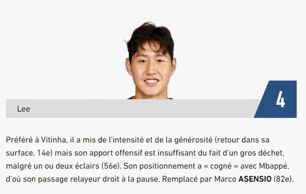 PSG 선수들이 전반적으로 낮은 점수를 받은 가운데, 이강인은 6명이나 됐던 4점 중 한 명에 포함됐다. ‘동료들과 더불어 평균 이하’였다는 평가로 볼 수 있다.