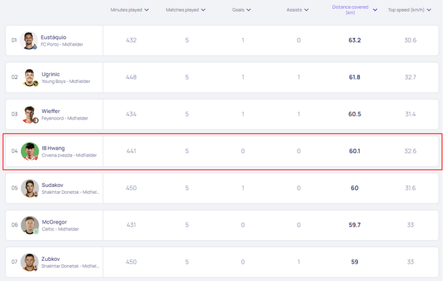 챔피언스리그 홈페이지에 따르면 황인범은 이동거리가 전체 4위다. FC포르투의 캐나다 국가대표 스테펜 유스타퀴토가 63.2km로 1위에 오른 가운데 영 보이스 스위스 대표팀 미드필더 필립 우그리니치가 61.8km로 2위다. 그 다음이 네덜란드 명문 페예노르트에서 뛰고 있는 필립 비퍼로 60.5km다.
