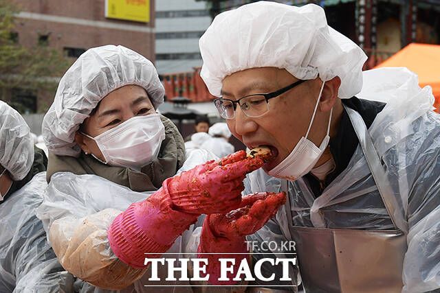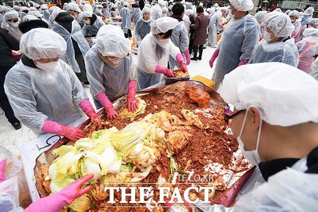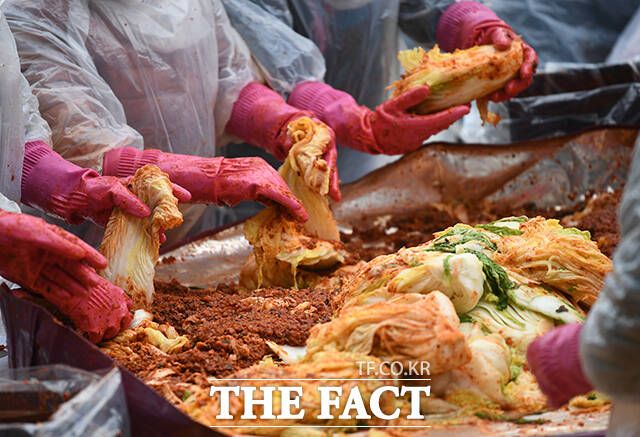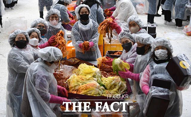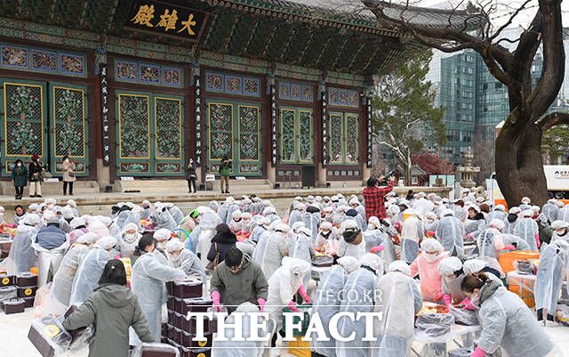 [더팩트ㅣ서예원 기자] 29일 오전 서울 종로구 조계사 대웅전 앞마당에서 열린 '이웃과 함께 행복한 조계사 김장 나눔전'에 참여한 승려와 신도들이 김장을 하고 있다.